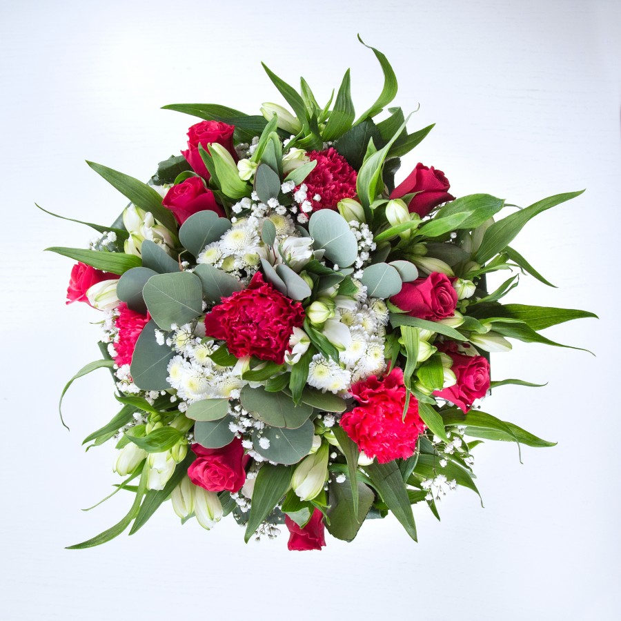 Celebrate love with our Luxurious Red Romance Bouquet. This captivating arrangement showcases lush red roses intertwined with delicate gypsophila and white chrysanthemums. Enhanced by elegant white alstroemeria and graceful aspidistra leaves, it’s a perfect blend of passion and grace.